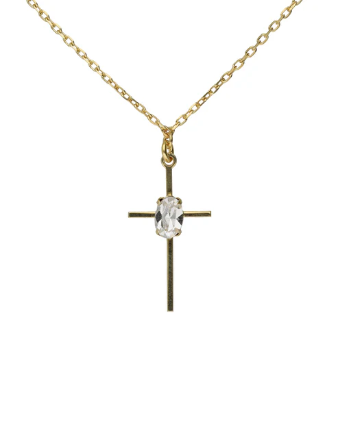 Collar corto con cristal blanco de Plata de Ley. Tamaño del motivo de 2cm x 1,2cm en forma de cruz y oval. Tamaño del cristal 0,6cm x 0,4cm. Largo de 40-45cm con cierre reasa y cadena diamantada de la colección Lieve