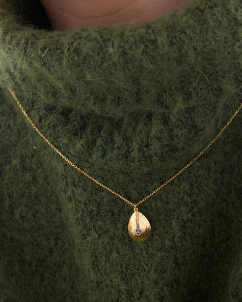 Collar corto con cristal violeta de Plata de Ley bañada en Oro de 18kt. Tamaño del motivo de 1,8cm x 1,3cm en forma de gota. Tamaño del cristal 0,2cm. Largo de 40-45cm con cierre reasa y cadena diamantada de la colección Bruma. Joyas con superficies trabajadas mediante técnicas como martelé, granallado o pulido satinado, que crean un contraste único y aportan profundidad. Un diseño orgánico y sofisticado, ideal para colecciones de alto impacto y versatilidad.