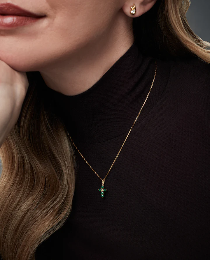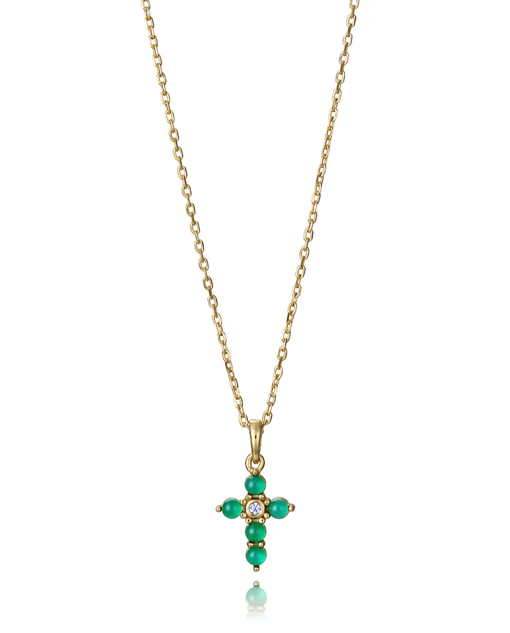 Un collar que combina espiritualidad y elegancia en un diseño lleno de significado. Realizado en plata de primera ley con un delicado baño de oro, se embellece con un colgante en forma de cruz adornado con piedras naturales de topacio blanco y ágata verde. El brillo puro del topacio aporta luz y sofisticación, mientras que la intensidad del verde evoca equilibrio y vitalidad, creando un contraste armónico y refinado. Con un largo de 42 cm más 3 cm de extensión, se adapta fácilmente a diferentes estilos y escotes. Una joya atemporal y simbólica, perfecta para mujeres que buscan distinción con un toque espiritual.