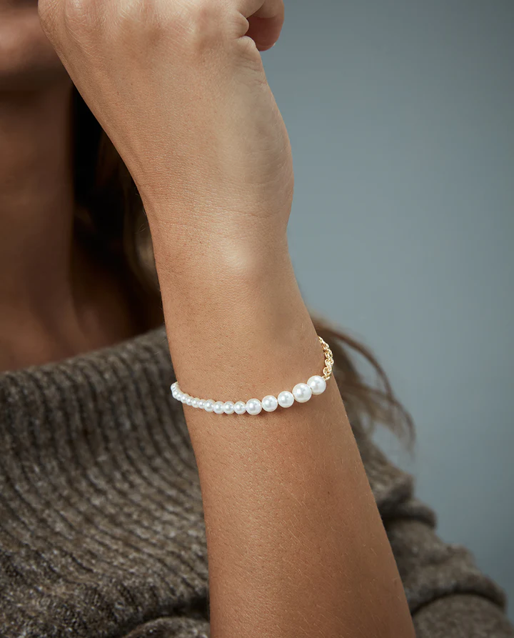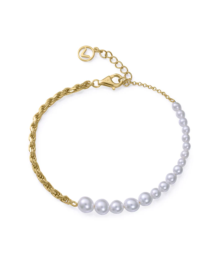 Una pulsera que irradia elegancia clásica con un toque moderno. Elaborada en plata de primera ley con un delicado baño de oro, se adorna con perlas sintéticas que evocan pureza, feminidad y sofisticación atemporal. Su diseño refinado la convierte en una joya versátil, perfecta para realzar looks diarios con sutileza o para aportar distinción en ocasiones especiales. Con un largo de 17,5 cm más 2 cm de extensión, se ajusta cómodamente a la muñeca, garantizando estilo y comodidad. Una pieza imprescindible para mujeres que buscan accesorios delicados y luminosos, capaces de aportar un aire distinguido y atemporal a cualquier conjunto.