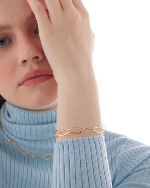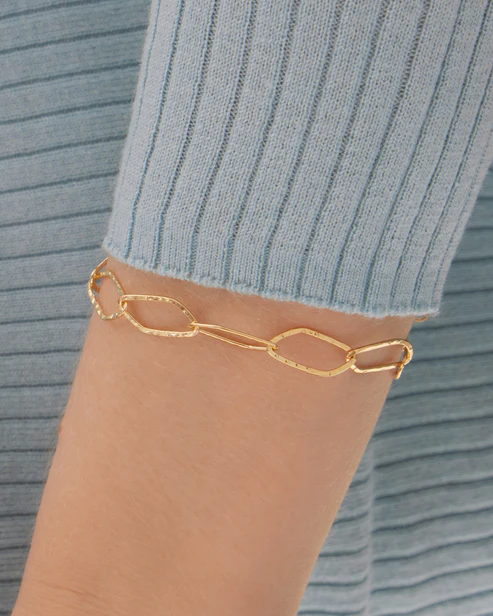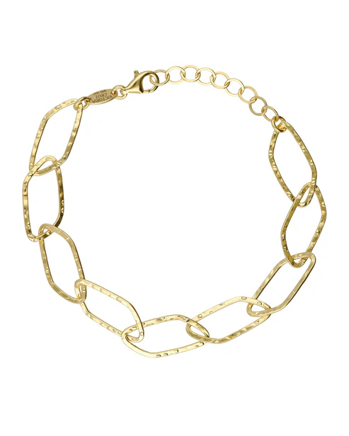 Pulsera de Plata de Ley. Tamaño del motivo de 1cm x 1,8cm en forma de eslabón. Largo de 16-19cm con cierre mosquetón de la colección Alpina. Joyas con superficies trabajadas mediante técnicas como martelé, granallado o pulido satinado, que crean un contraste único y aportan profundidad. Un diseño orgánico y sofisticado, ideal para colecciones de alto impacto y versatilidad