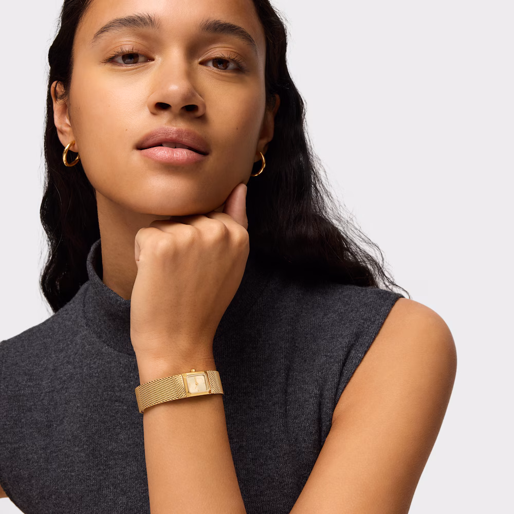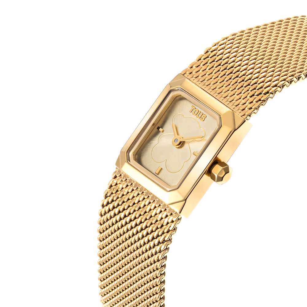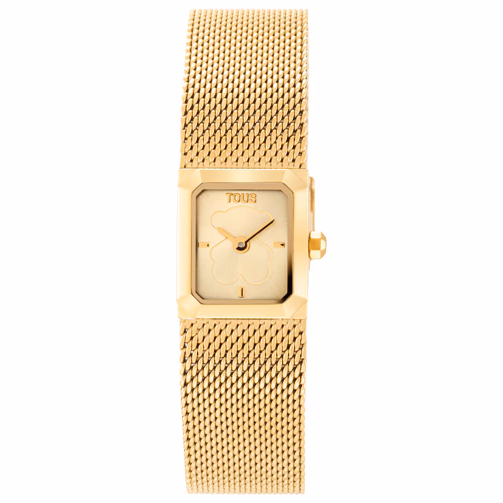 Reloj analógico TOUS MiniMesh con brazalete de malla milanesa de acero inoxidable y acero dorado. Dimensiones: 16,3 mm x 18,8 mm. Cristal: mineral plano octogonal. Funciones: hora y minutos. Impermeable a 3 ATM. Brazalete: 16mm x 16mm x 70mm / 16mm x 16mm x 110mm. Cierre ajustable con cierre de seguridad.