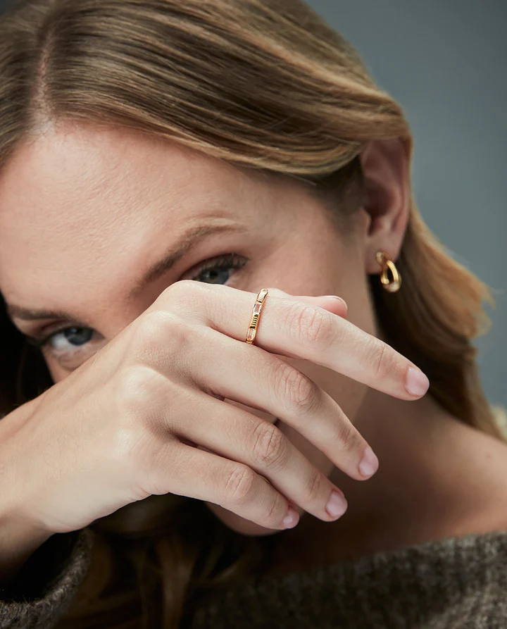 Un anillo que transmite delicadeza y sofisticación en cada detalle. Elaborado en plata de primera ley con un elegante baño de oro, se distingue por la pureza de sus cuatro circonitas baguette blancas, talladas con precisión para reflejar la luz con un brillo radiante. Su diseño minimalista y atemporal lo convierte en una pieza versátil, perfecta para combinar con otras joyas o lucir como protagonista de tu look. Disponible en talla 14, es una joya pensada para mujeres que valoran la elegancia sutil y buscan accesorios capaces de acompañar cada ocasión con estilo y distinción.